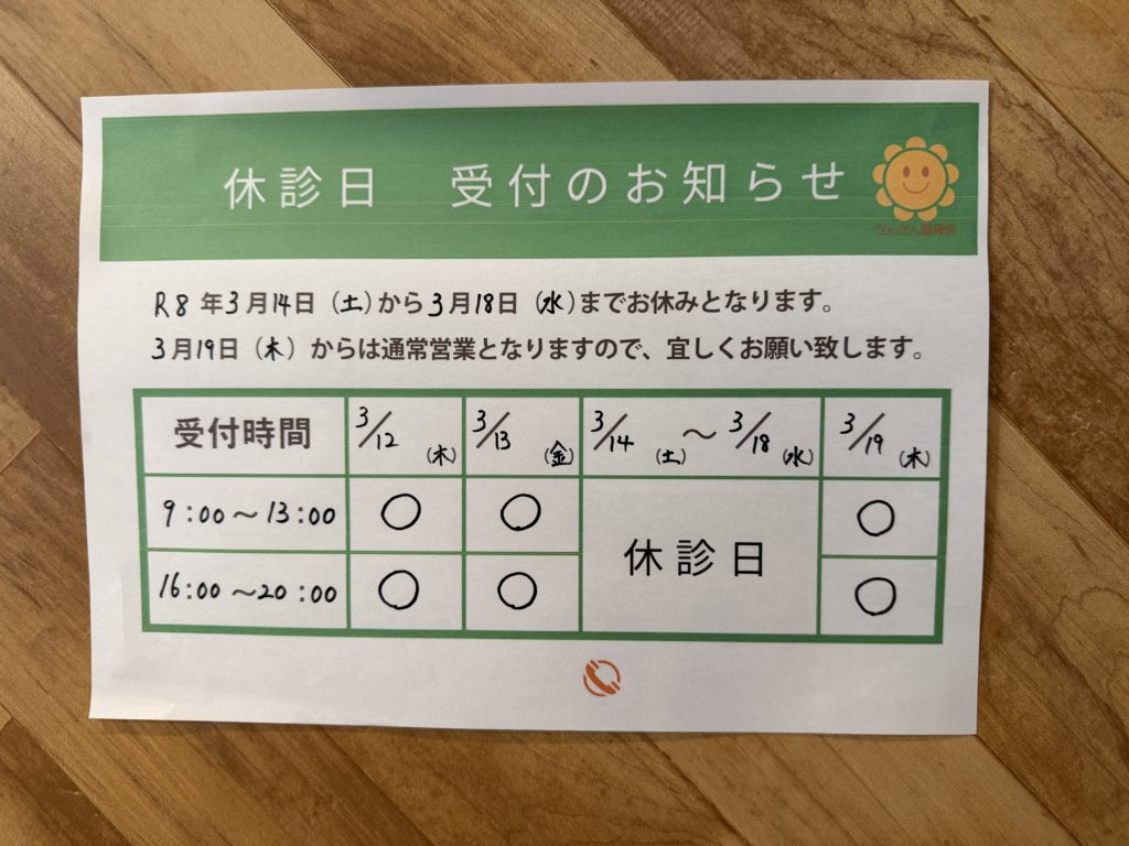 カテゴリー 未分類 【休診日のお知らせ】 投稿者 作成者: sunsun 投稿日 2026年2月25日 いつもさんさん整骨院をご利用いただきありがとうございます。 令和8年3月14日(土)〜3月18日(水)まで休診とさせていただきます。 3月19日(木)より通常通り診療いたします。 ご不便をおかけいたしますが、何卒よろしくお願いいたします。 ← 年末年始の受付について